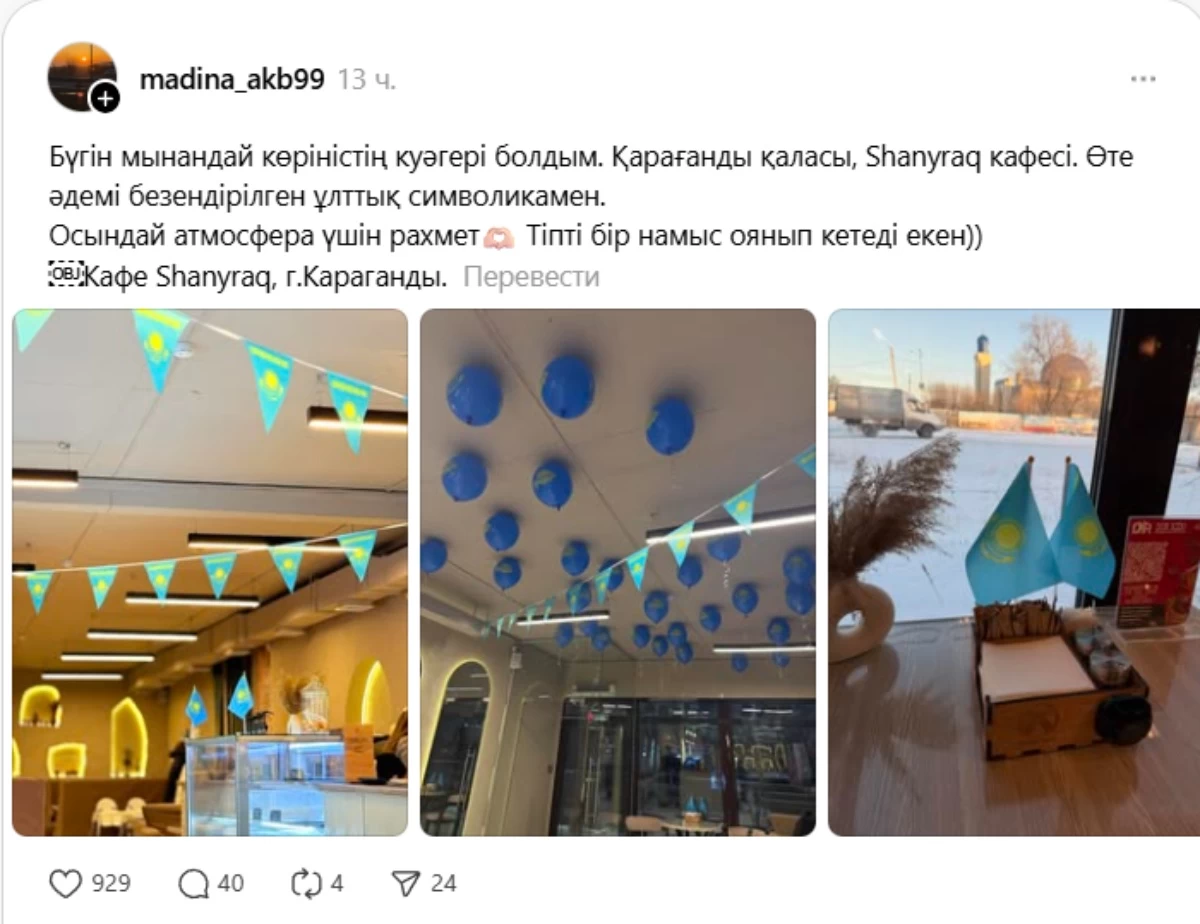 “Threads-те 16-желтоқсанға орай Астаналық дүкен барлық жерін шармен және Қазақстан жалауларымен безендіргенін көріп, біз де қосылып, қолдайық деп шештік. Қонақтарымызға ұнап жатыр”, – деп жазды кафе әкімшілігі.