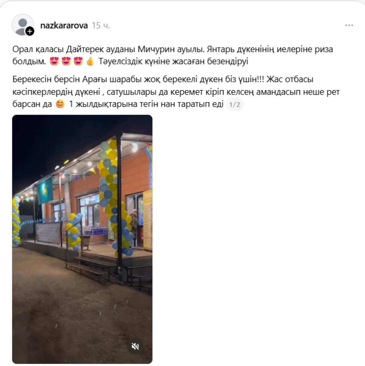 “Орал қаласы, Байтерек ауданы, Мичурин ауылы. Янтарь дүкенінің иелеріне риза болдым. Тәуелсіздік күніне жасаған безендіруі керемет шыққан. Берекесін берсін. Жас отбасы кәсіпкерлердің дүкені , сатушылары да керемет. Кіріп келсең жылы сәлемдеседі. Дүкеннің 1 жылдығына тегін нан таратып еді”, – деп жазды ол.