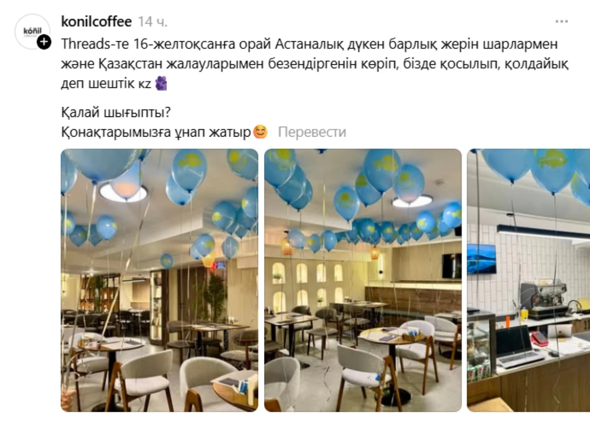 “Threads-те 16-желтоқсанға орай Астаналық дүкен барлық жерін шармен және Қазақстан жалауларымен безендіргенін көріп, біз де қосылып, қолдайық деп шештік. Қонақтарымызға ұнап жатыр”, – деп жазды кафе әкімшілігі.