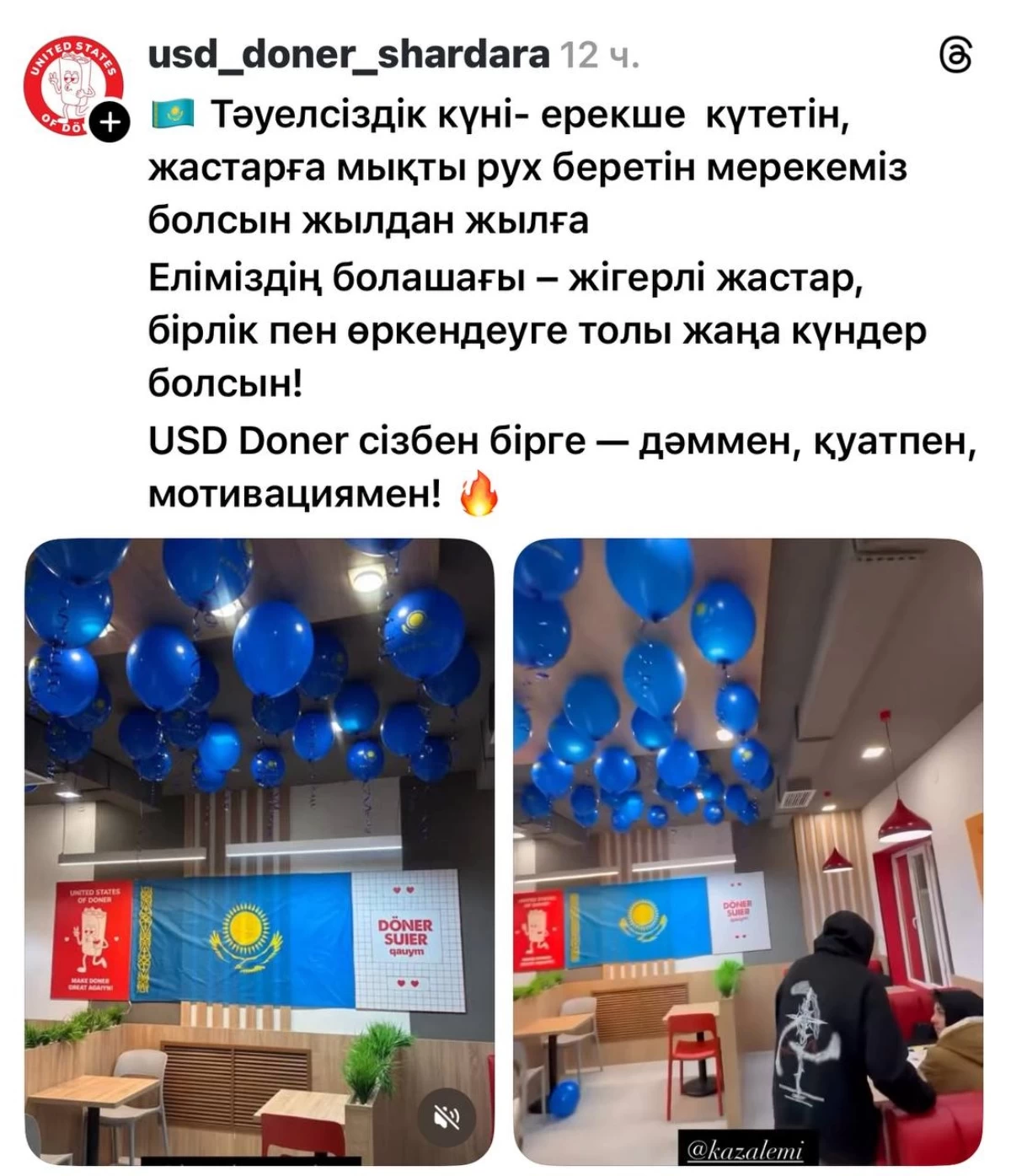 “Тәуелсіздік күні ерекше күтетін, жастарға рух беретін мерекеміз болсын. Жылдан жылға Еліміздің болашағы өркендей берсін. Жігерлі жастарымыз көбейіп, еліміз өркендей берсін. USD Doner сізбен бірге”, – деп жазды дәмхана әкімшілігі.