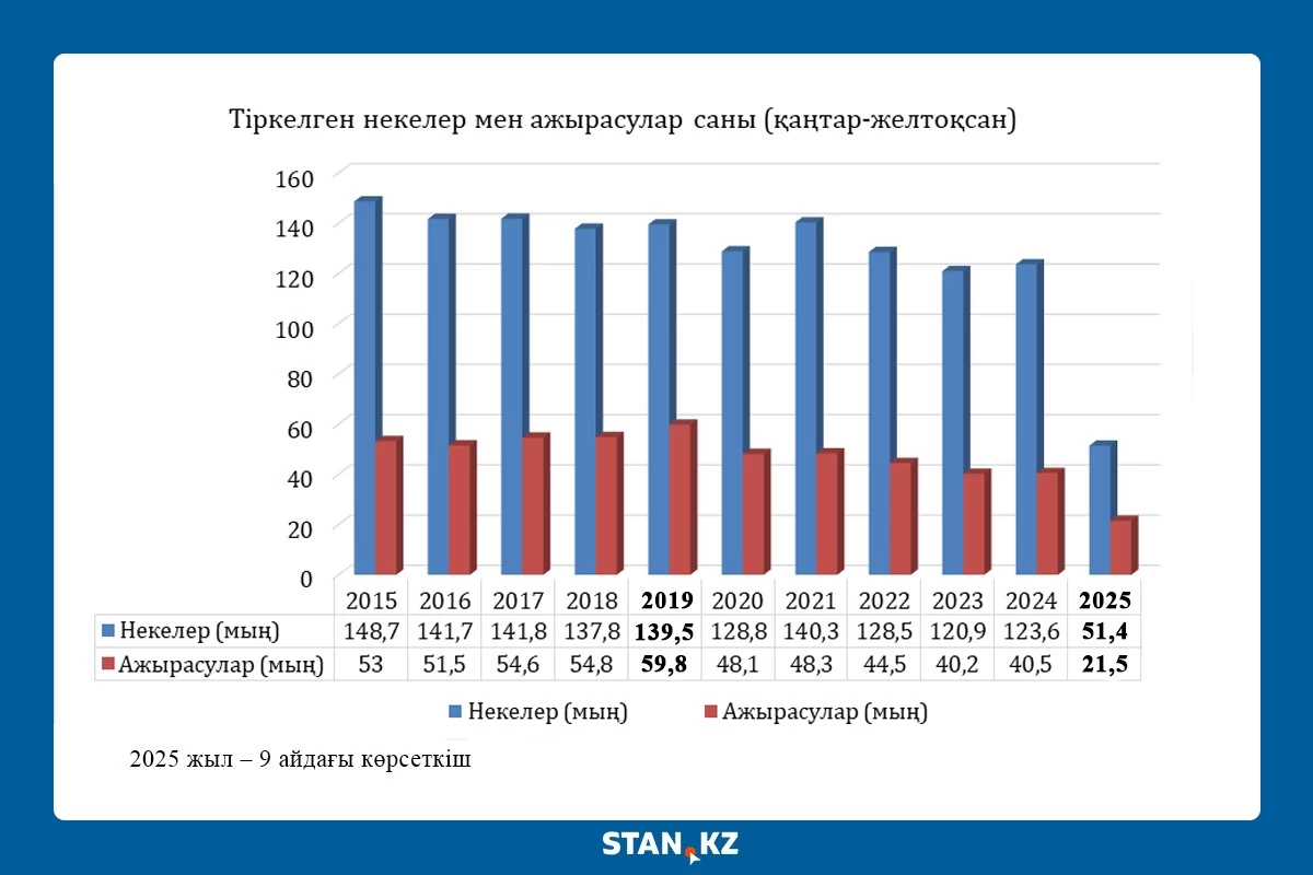 Кейінгі онжылдықта Қазақстанда әлеуметтік қолдау көлемі ұлғайған сайын, некесін бұзған отбасылардың саны да арта түскен екен. 2010 жылдары 40-45 мың неке бұзылса, 2018 жылы олардың саны 54,8 мыңға, ал 2019 жылы – 59,8 мыңға жеткен. Бұл Қазақстан тарихындағы ең жоғары көрсеткіштердің бірі.