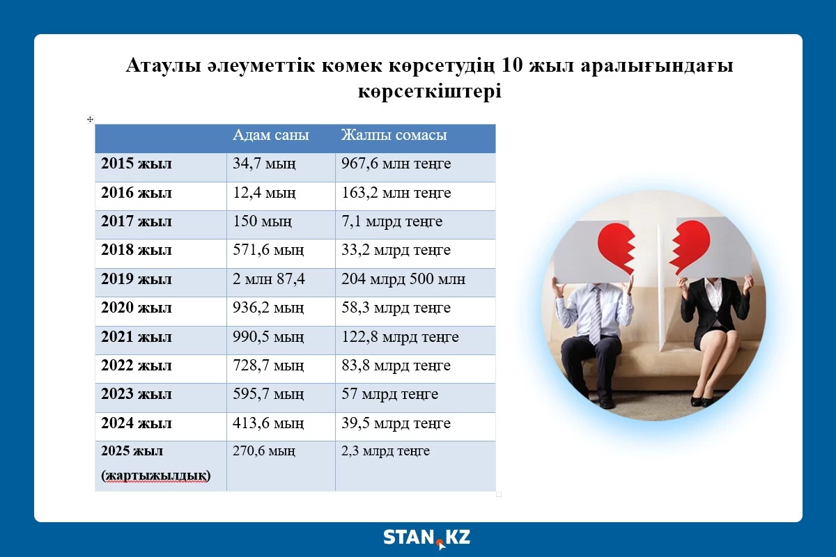 Президент Қасым-Жомарт Тоқаев таяудағы жолдауында елімізде бір кездері "әлеуметтік саланың жанашырлары" ойлап тапқан "толық емес отбасы" ұғымы ажырасу толқынын күшейтіп, жалқаулық пен масылдықтың тамыр жаюына жол ашқанын қатаң сынға алды. Мемлекет басшысы бүгінде отбасы мүшелерінің көбі нысаналы әлеуметтік көмек пен жәрдемақыға үміт артып, еңбекке құлық танытпай отырғанын айтты. Осыған байланысты Stan.kz редакциясы соңғы он жылдағы деректерді саралап, әлеуметтік көмек енгізілгеннен бері қанша қазақстандықтың некесін бұзғанын және қанша отбасының жәрдемақыға тәуелді болғанын есептеп шықты.