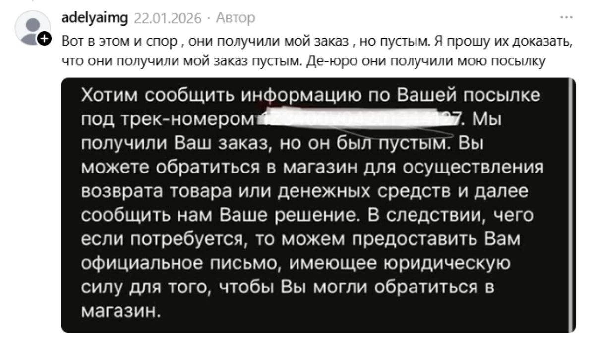 “Сайтта тапсырыс рәсімдеген кезде оферта талаптарымен келісесіз. Ол жерде компанияның қоймаға жеткізіліп, қабылданған сәлемдемелер үшін ғана жауапты екені көрсетілген. Демек, сәлемдемесі қоймаға жетпеген адамдар, өкінішке қарай, заң жүзінде талап қоя алмайды. Сіздің жағдайыңызда компания тарапынан ресми жауап пен дәлелдерді (бейнежазбалар, растау құжаттары) күту ғана қалды”.