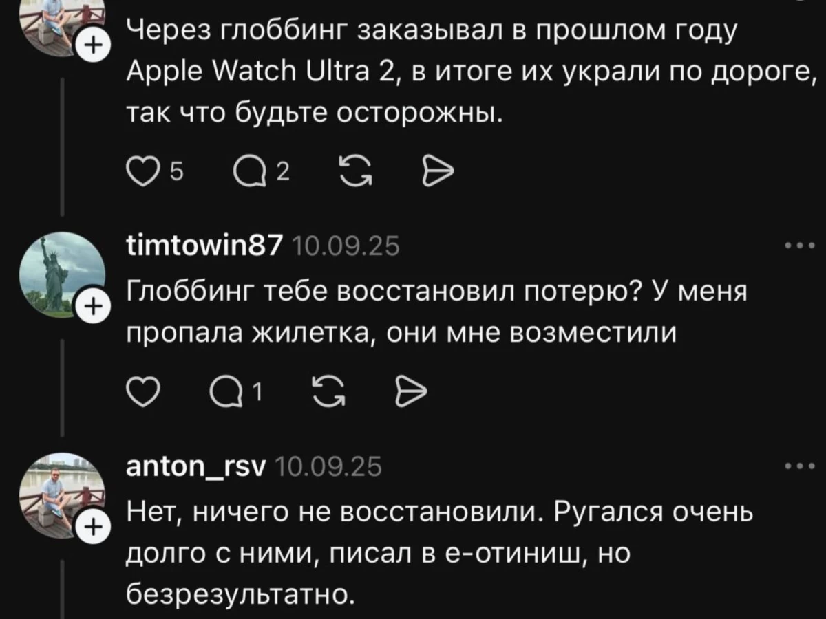 “Өткен жылы Globbing арқылы Apple Watch Ultra 2 сағатына тапсырыс берген едім. Ол жолда ұрланып, сол күйі жоғалып кетті. Сондықтан абай болыңыздар! Globbing ештеңені қалпына келтірмеді. Олармен ұзақ уақыт дауластым, электрондық пошта арқылы хат жаздым, бірақ нәтиже болмады”.