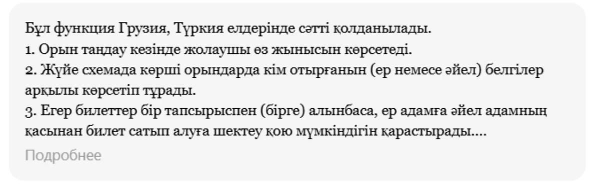 “Шетелде орын таңдау кезінде жолаушы өз жынысын көрсетеді. Жүйе схемада көрші орындарда кім отырғанын (ер немесе әйел) белгілер арқылы көрсетіп тұрады. Егер билеттер бір тапсырыспен (бірге) алынбаса, ер адамға әйел адамның қасынан билет сатып алуға шектеу қою мүмкіндігін қарастырады. Осылайша, әйел адамдар өздерін қауіпсіз сезінсе және діттеген жеріне аман-сау жетсе екен деймін”, – деп жазды ол.