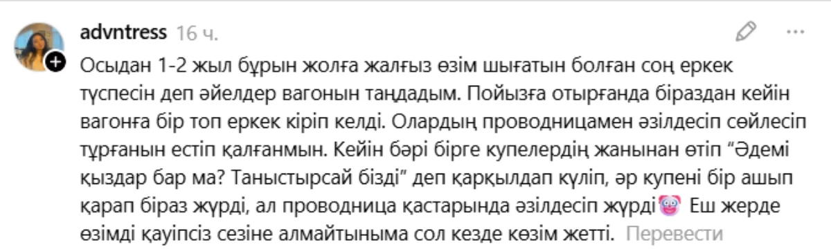 “Бүгінде қосымша арқылы билет алу өте ыңғайлы. Алайда қауіпсіздік мәселесіне қатысты маңызды бір функцияны қосуды ұсынамын. Қазір қалааралық автобустар мен пойыздарда әйел жолаушылардың бейтаныс ер адамдармен көрші отыруы көптеген қолайсыздықтар мен қауіптер (зорлық, тиісу, мазалау, қысым) тудырады. Осы себепті, билет сатып алу кезінде орын таңдау интерфейсіне жолаушының жынысын (ер/әйел) белгілеу функциясын енгізуді сұраймын”, – деп жазды Ақбота есімді Threads қолданушысы.