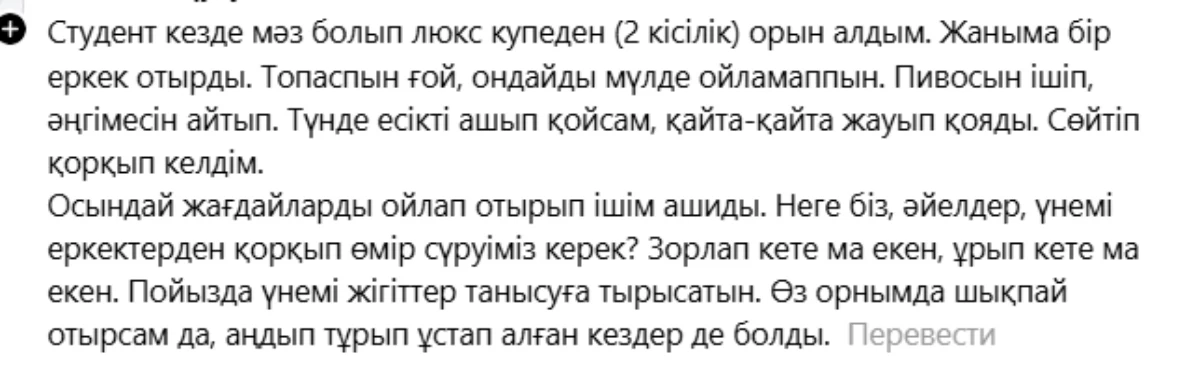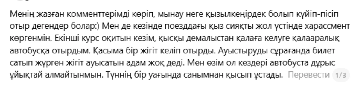 Басқа да қыздар автобуста болған осындай оқиғаны баяндап берді. Оның сөзінше, қорқынышты жәйт Алматыдан Шымкентке қатынайтын автобуста болған.