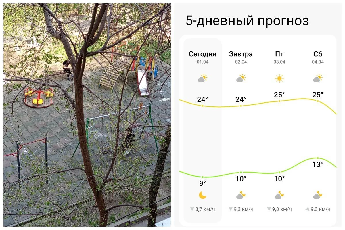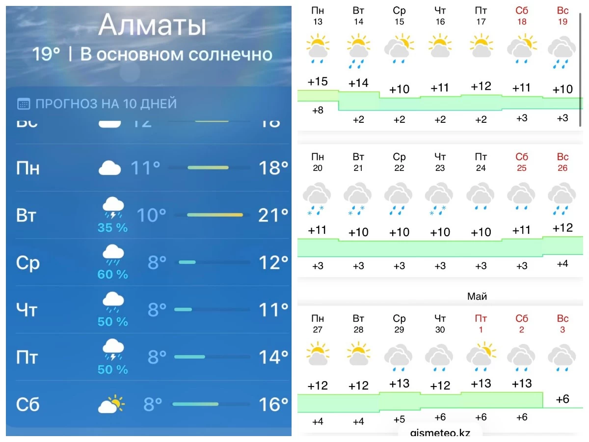 Синоптиктердің мәліметінше, алдағы күндері температура +27…+29°C-қа дейін көтеріліп, тіпті көктем емес, шілденің аптабын еске салмақ. Дегенмен одан кейін Алматыда жылыту маусымының аяқталмауы алдағы суықтың әсерімен байланысты деп отыр синоптиктер. Сәуірдің алғашқы аптасынан кейін қалада ұзаққа созылатын жаңбыр жауады. Соның салдарынан ауа температурасы қазіргі +20°C шамасынан +12°C-қа дейін төмендеуі мүмкін.