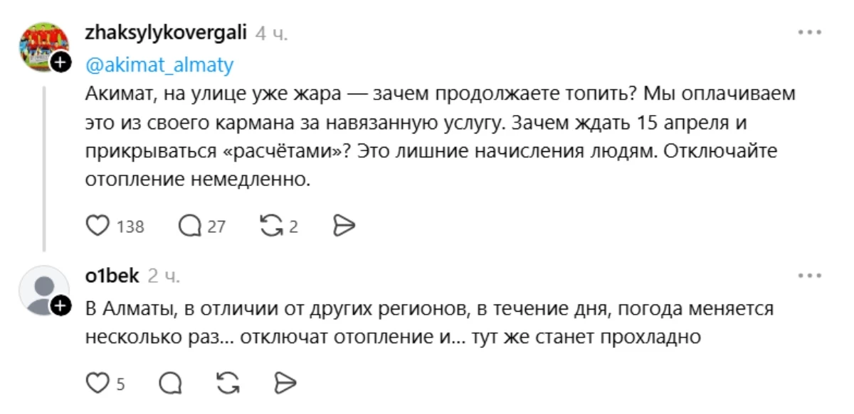 "Алматыда жылуды қашан өшіреді? Неге біз көшені жылытып отырмыз? Бәрі терезесін тәулік бойы ашып отыр. Үйдің іші шыдатпайды. Осы екі апталық сәуірдегі жылу беру кезеңін күздің басына ауыстырса дұрыс болар еді, ол кезде суық болады. Сәуірде 20+ градус болса, жылу не үшін керек? Көшеде адамдар футболкамен жүр", – деді тұрғын.