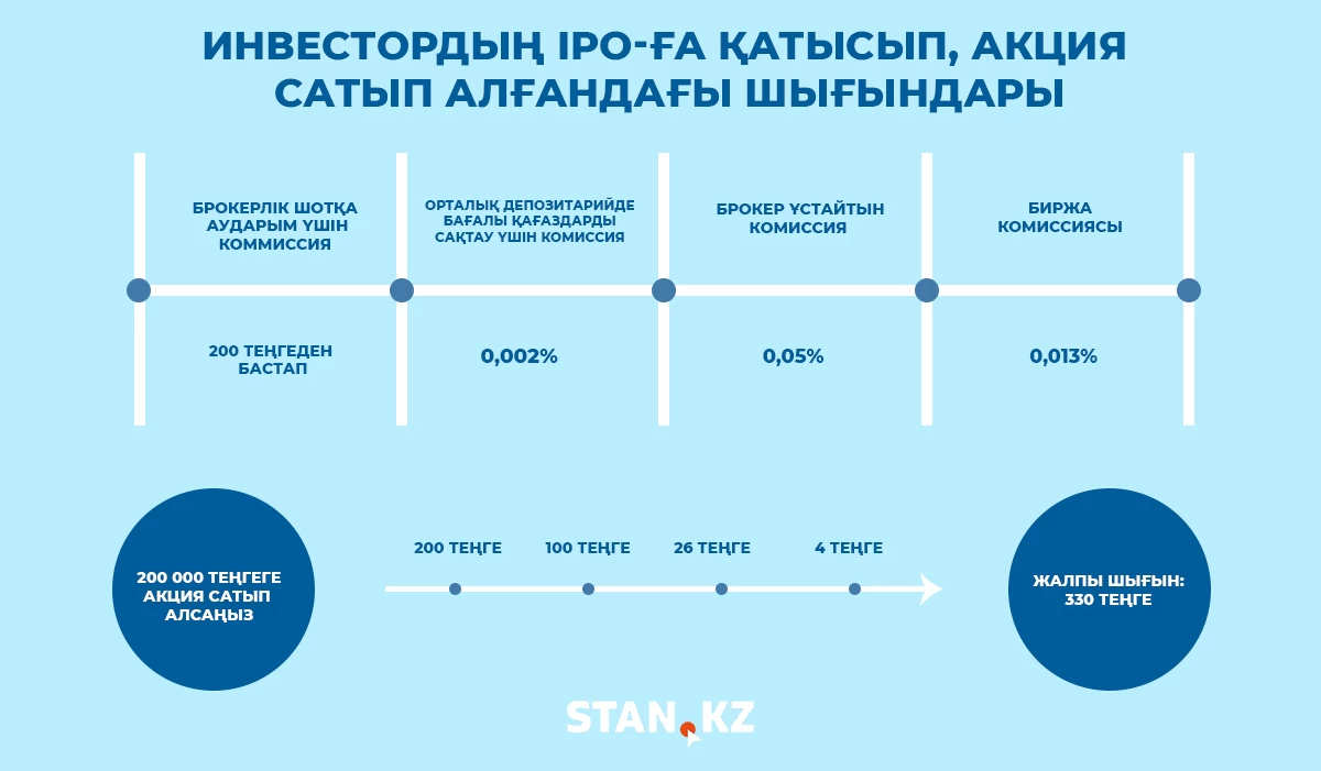 Мәселен, IPO кезінде 200 000 теңгеге акция сатып алуды ұйғардыңыз делік. Ол үшін сіз тиісті қаражатты брокерлік шотыңызға аударуыңыз қажет. Бұл тұрғыда банк аударым үшін комиссия ұстайды (шамамен 200 теңге немесе одан жоғары). Орта есеппен брокер ұстайтын комиссия мөлшерін 0,05% деп алайық. Биржа комиссиясы 0,013%-ға жетеді. Орталық депозитарийде бағалы қағаздарды сақтау үшін комиссия 0,002%-ға тең (шотта қалған активтердің орташа көлемі).