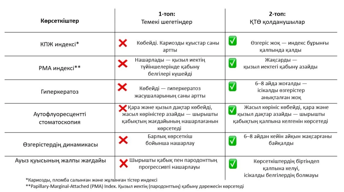 Қыздырылатын темекіге өткен топта алғашқы үш айда айтарлықтай өзгеріс болмаған, көрсеткіштер тұрақты сақталған. Ал шамамен алты-сегіз айдан кейін айқын оң динамика байқалған: гиперкератоз толық жойылған, PMA жақсарып, қызыл иектің жағдайы жақсарған. КПЖ деңгейі өзгеріссіз қалып, нашарлау болмаған. Шырышты қабаттағы жасыл түстердің жарқырауы артқан, ал патологиялық дақтар азайған.