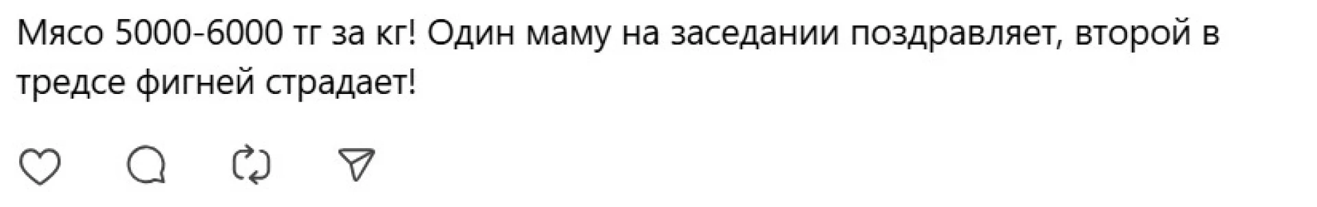 “Ет 5-6 мың теңгеге жетті, біреуі анасын құттықтап, екіншісі тредсте түкке тұрмайтын дүние жазып ерігіп отыр" деді.