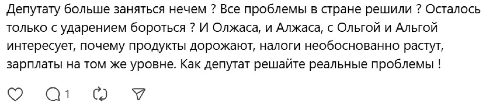 “Орыстар "Олжас" деген атты айтқанда неге "Алжас" дейді де, "Ольганы" айтқанда, "Альга" демейді?! Әлде біз білмейтін қандай да бір ережелер бар ма?”, – деп жазған депутат.