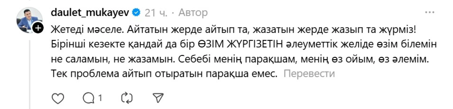 "Мәселе жеткілікті. Қажет жерде айтамыз, қажет жерде жазамыз! Бұл – ең алдымен менің жеке әлеуметтік желідегі парақшам, не жариялайтынымды, не жазатынымды өзім шешемін. Бұл – менің парақшам, менің ойларым, менің әлемім. Бұл тек мәселелер туралы жазу үшін ғана ашылған парақша емес", – деді Даулет Мұқаев.