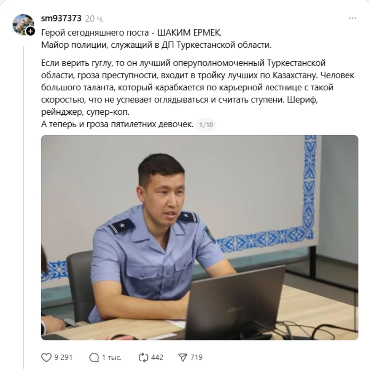 “Бұл жазбаны Түркістан облысы полиция департаментінің басшысы Заппаров Арыстанғани Расылханұлы көргенін қалаймын! Төменде Түркістан облысының полиция майорымен болған хат алмасу ұсынылған. Ол бес жасар қыздың конституциялық құқықтарын шектеді деп есептеймін. Неге Түркістан полициясы өзін Конституциядан жоғары қояды?”, – делінген жазбада.