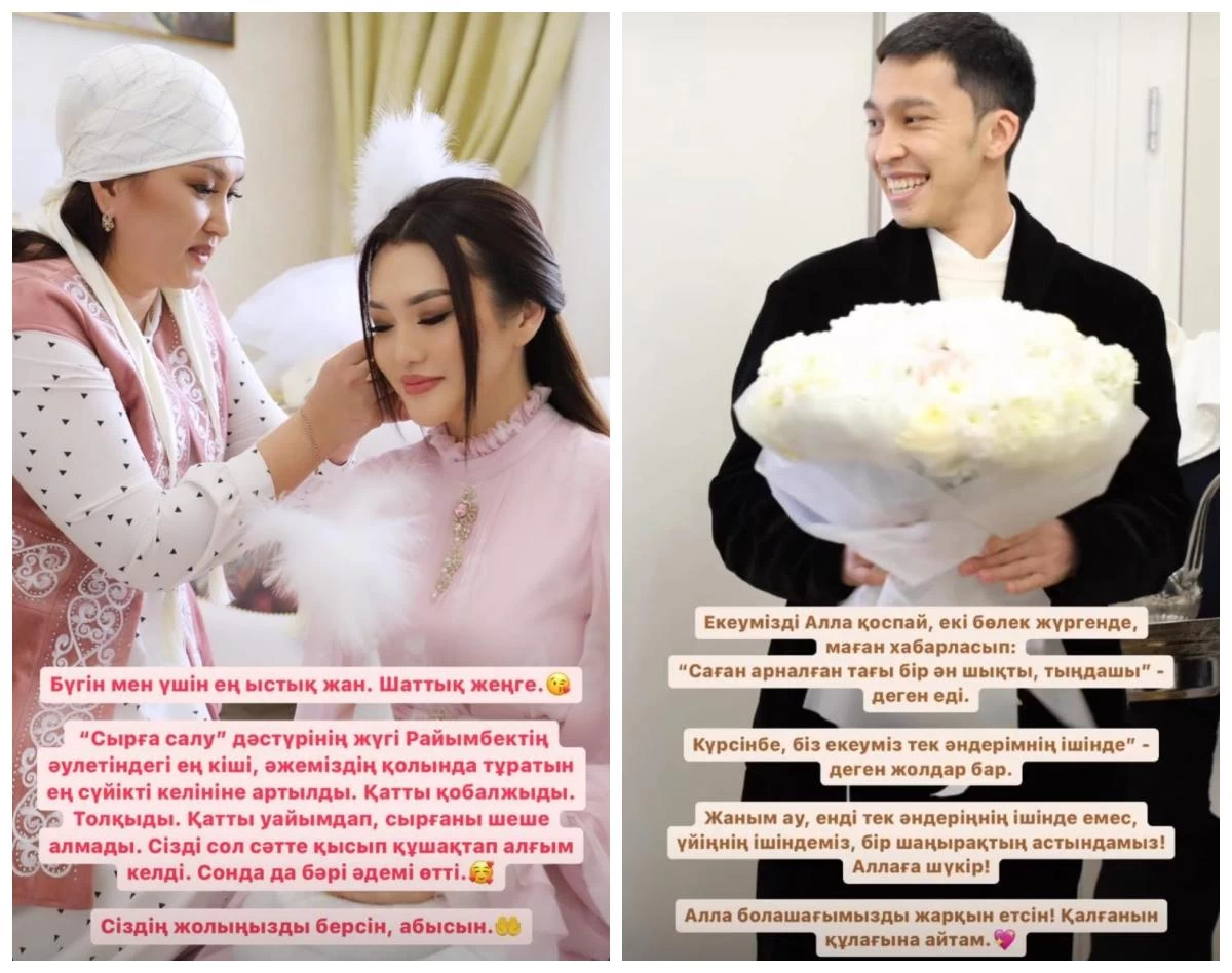 “Екеуімізді Алла қоспай, екі бөлек жүргенде, маған хабарласып: “Саған арналған тағы бір ән шықты, тыңдашы” деген еді. “Күрсінбе, біз екеуіміз тек әндерімнің ішінді” деген жолдар бар. Жаным-ау, енді тек әндеріңнің ішінде емес, үйіңнің ішіндеміз, бір шаңырақтың астындамыз. Аллаға шүкір. Алла болашағымызды жарқын етсін! Қалғанын құлағына атамын”, – деп жазды ол ттолқынысын жасыра алмай.