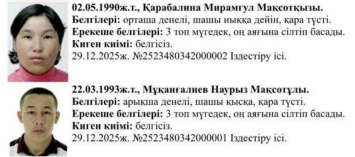 Еске салайық, бұған дейін Атырау облысы Қызылқоға ауданына қарасты Жангелдин ауылында бір отбасының төрт мүшесі із-түссіз жоғалып кеткен еді. Отбасы 2025 жылдың күзінде жоғалған. Іздеудегі адамдар 1959 жылы туған Мақсот Қарабалин, оның жұбайы 1961 жылы туған Насипа Өтешқалиева, олардың балалары 1990 жылы туған Мейрамгүл Қарабалина мен 1993 жылы туған Наурыз Мұқанғалиев.
