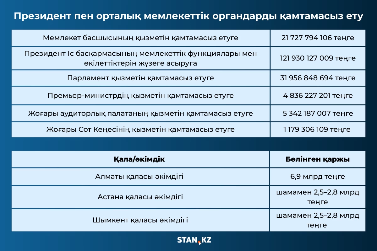 Қазақстан премьер-министрінің қызметін қамтамасыз етуге кететін шығын Алматы әкіміне жұмсалатын қаражаттан аз болып шықты. 2026–2028 жылдарға арналған республикалық бюджет туралы құжатта Үкімет басшысына 4,8 миллиард теңге қарастырылса, әкімге 6,9 миллиард теңге бөлінген. Осы орайда Stan.kz президенттен бастап парламентке дейінгі бірқатар мемлекеттік органдарды қамтамасыз етуге қанша қаржы жұмсалатынын зерттеп көрді.