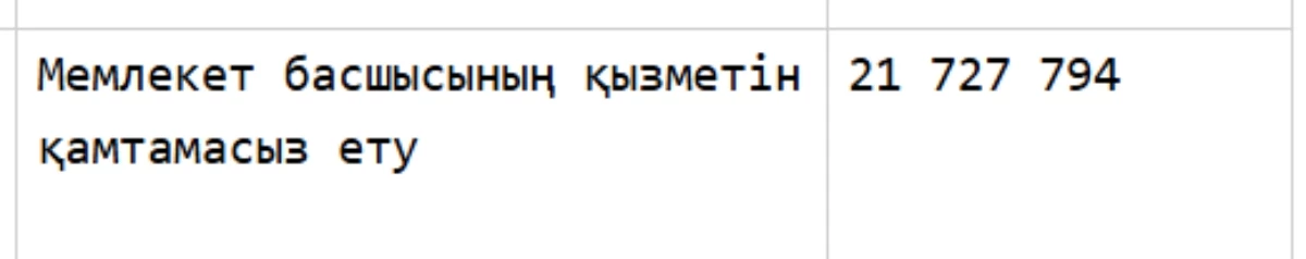 Мемлекет басшысының қызметін қамтамасыз етуге – 21 727 794 106 теңге.