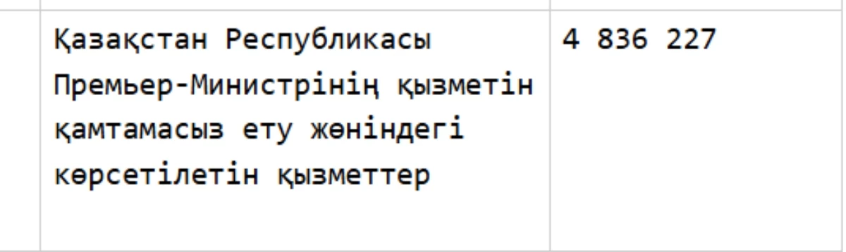 Премьер-министрдің қызметін қамтамасыз етуге – 4 836 227 201 теңге.