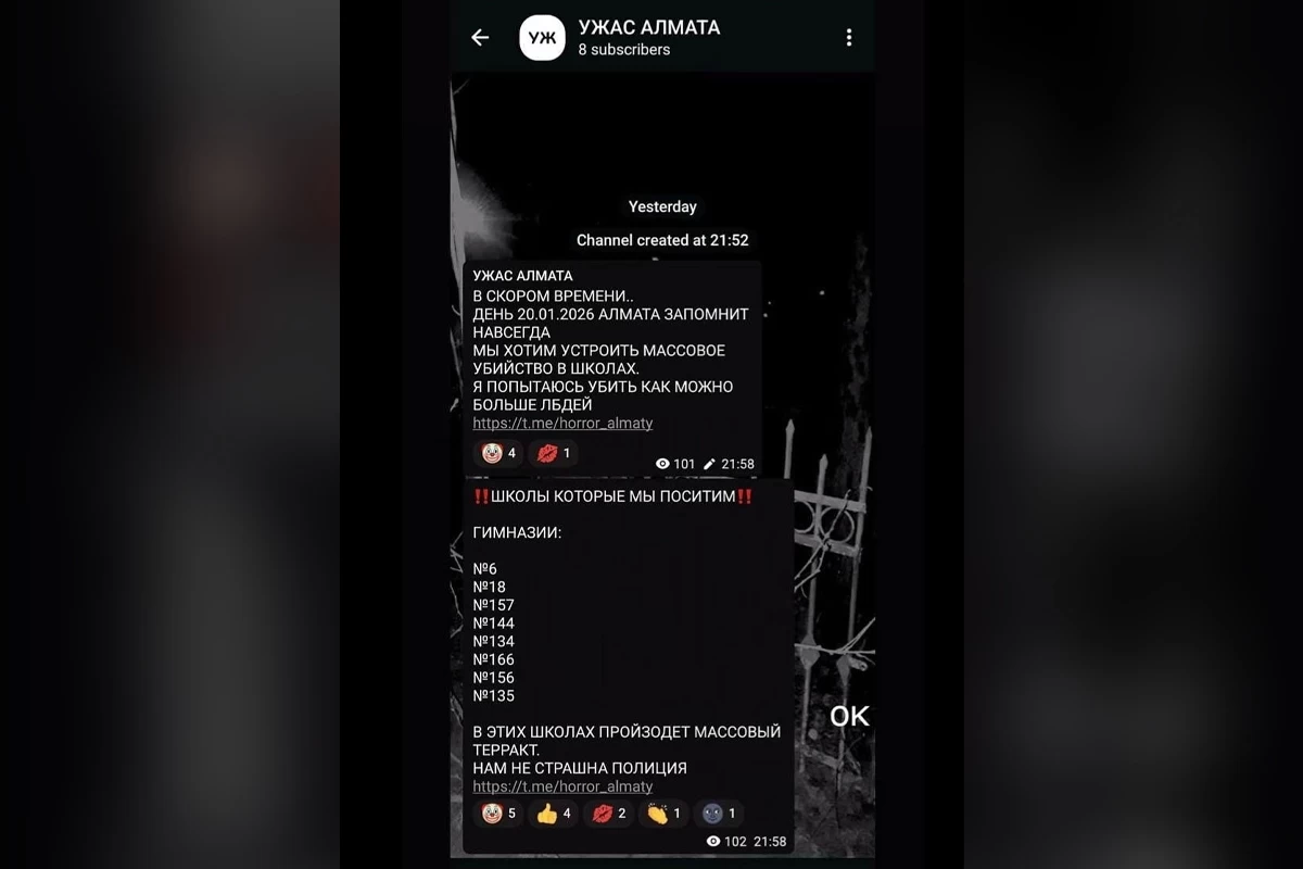 “Жақын арада… 2026 жылы 20 қаңтар күні Алматы қаласы мәңгілікке есте қалады. Мектептерде жаппай атыс ұйымдастырғымыз келеді. Мүмкіндігінше көбірек адамды өлтіруге тырысамын. Біз баратын мектептер: №6, №18, №157, №144, №134, №166, №156, №135. Осы мектептерде жаппай террористік акт болады”, – деп жазылған хабарламада.