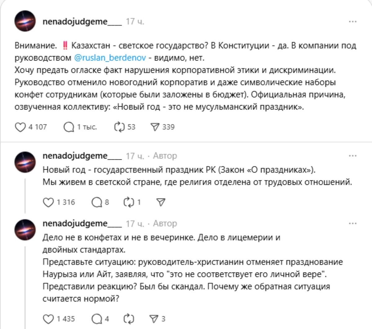 “Бұл ұжымдық этиканы өрескел бұзу әрі кемсітушілік белгісі. Корпоративтің ресми түрде тоқтатылу себебі “Жаңа жыл мұсылман мерекесі емес” деп көрсетілген. Жаңа жыл Қазақстандағы мемлекеттік мереке (“Мерекелер туралы” заңға сәйкес). Біз дін мемлекеттен және еңбек қатынастарынан бөлінген зайырлы елміз. Мұнда мәселе тәттілерде де, кеште де емес. Мәселе екіжүзділік пен қос стандартта. Елестетіп көріңіздер: егер христиан дінін ұстанатын басшы Наурызды немесе Айтты “менің жеке сеніміме сай келмейді” деп тоқтатса, қоғам қалай қабылдар еді? Міндетті түрде дау туар еді. Ал неге керісінше жағдай қалыпты нәрсе ретінде қабылданады?”, – деп жазды ол.