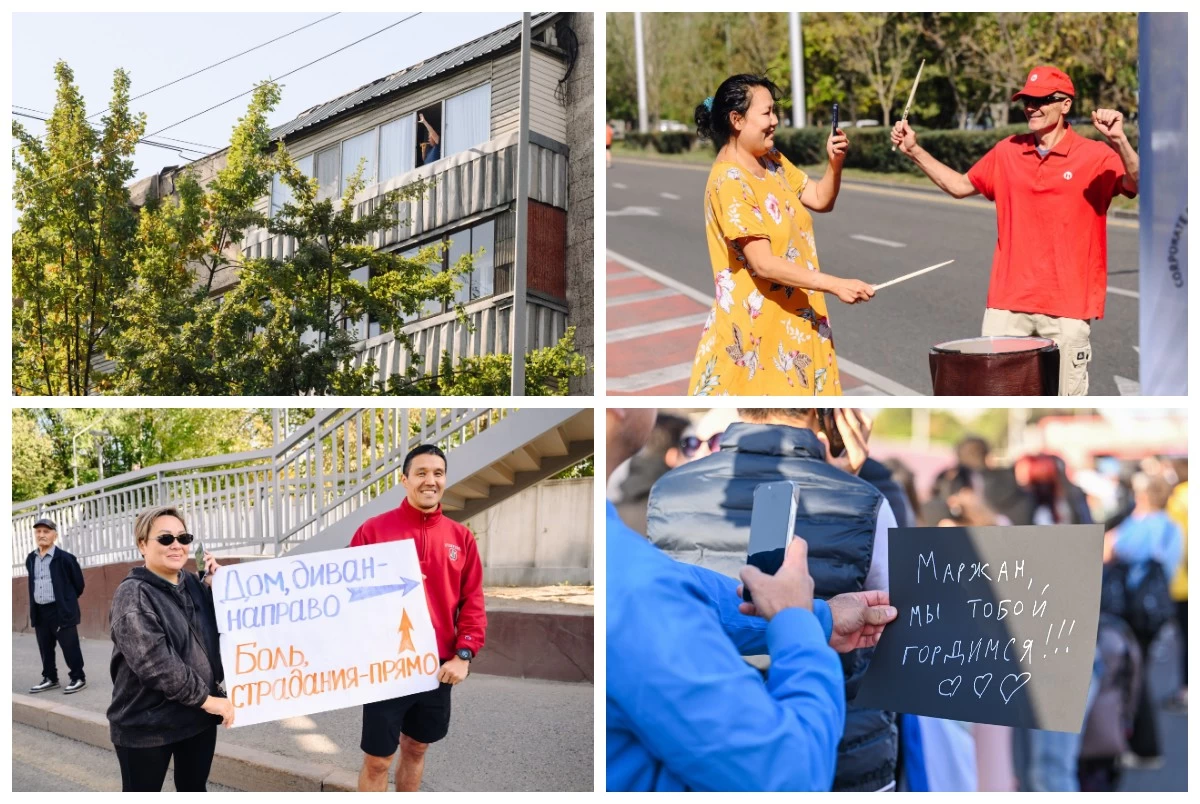 Кейбірі ұлдарымен бірге жолдың шетіне жайғасып, әрбір жүгіріп өткен қатысушыға қолдарымен "бестік" берді. Бұл көрініс қатысушылардың жүректеріне жылы тисе керек, өтіп бара жатқандардың бәрі еріксіз жымиып қоя берді.