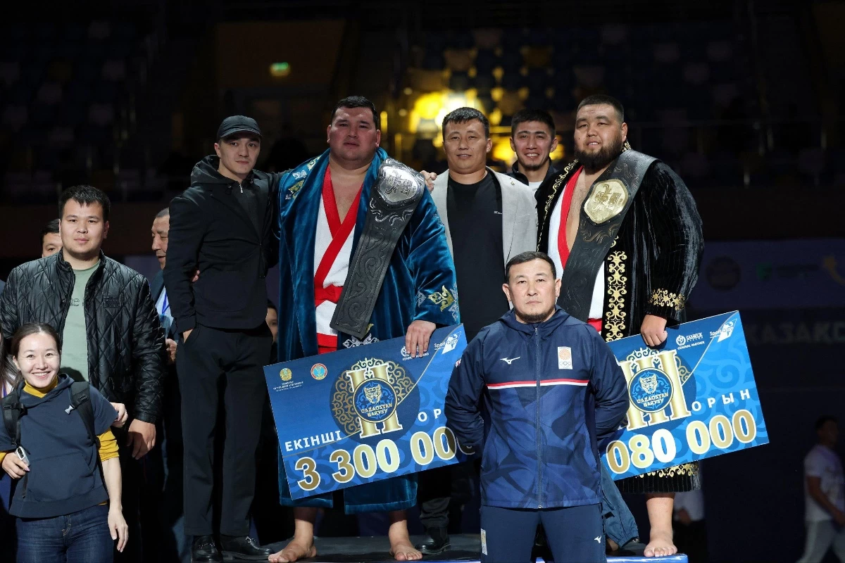 Күміс белбеу мен 3,3 млн теңге былтырғы чемпион, 151 келі салмақтағы Ерасыл Қажыбаевқа (“Қажыбай”) бұйырды. Қола белбеу мен 1,08 млн теңге Маңғыстау облысының балуаны, Қара бура” лақапты Нұрдәулет Жарылғаповқа табысталды.