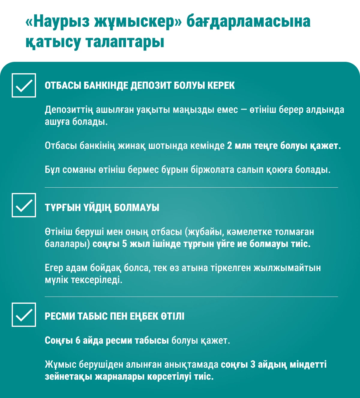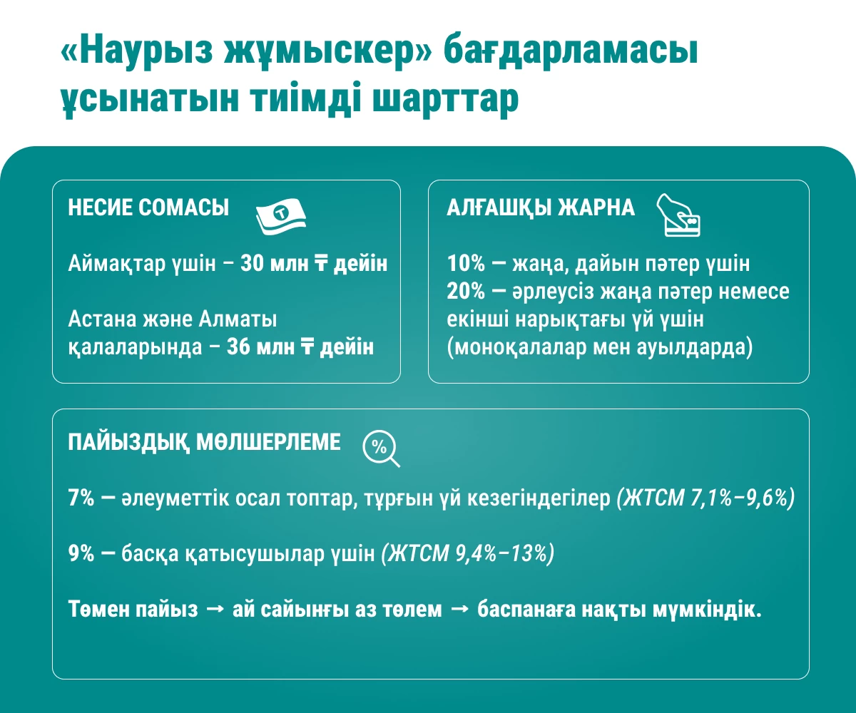 – Әлеуметтік осал топтағы тұрғындар, яғни тұрғын үй кезегінде тұрғандар, несиені бар болғаны жылдық 7% мөлшерлемемен (ЖТСМ 7,1%–9,6%) рәсімдей алады.