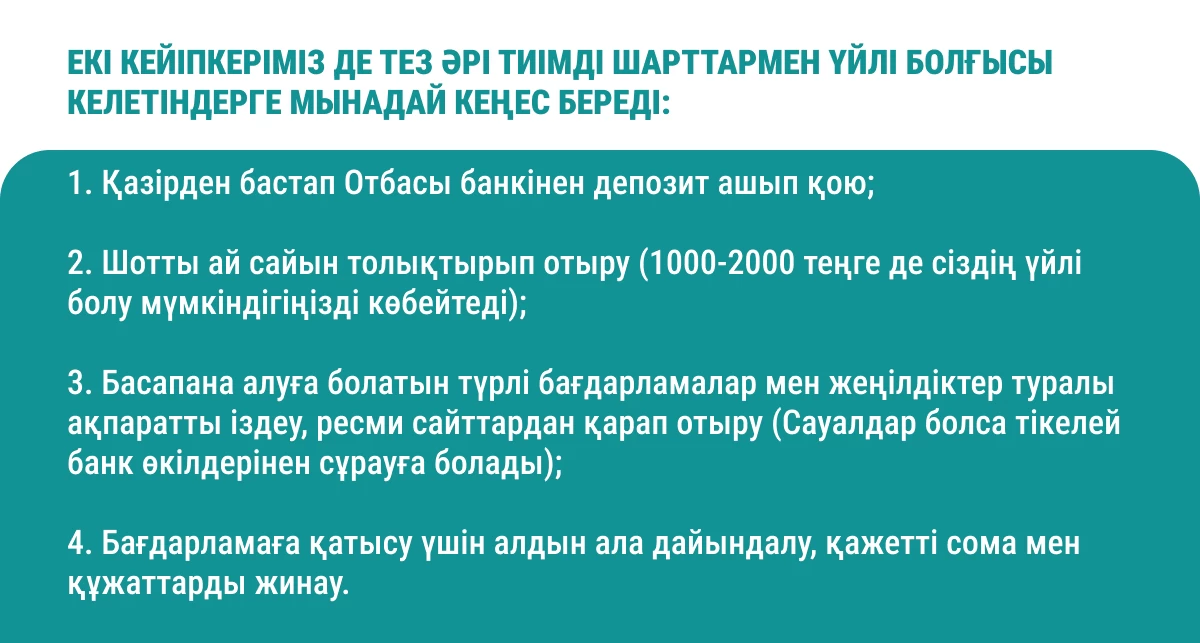Жасұлан осы тұста үй алуды армандап жүргендерге қазірден бастап әрекет етіп, Отбасы банкте қаражат жинуға кеңес берді.