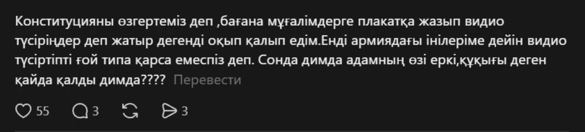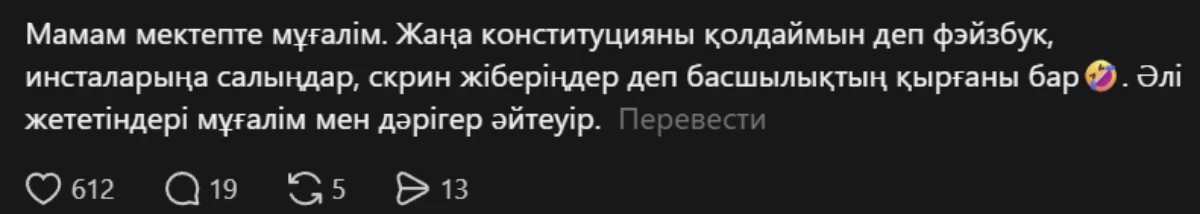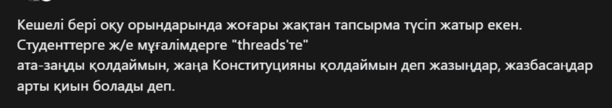 “Кешелі бері оқу орындарында жоғары жақтан тапсырма түсіп жатыр екен. Студенттерге ж/е мұғалімдерге Тhreads желісінде Ата заңды қолдаймын, жаңа Конституцияны қолдаймын деп жазыңдар, жазбасаңдар арты қиын болады деп айтыпты”.
