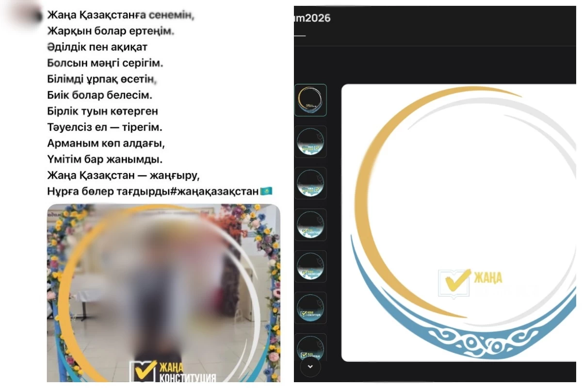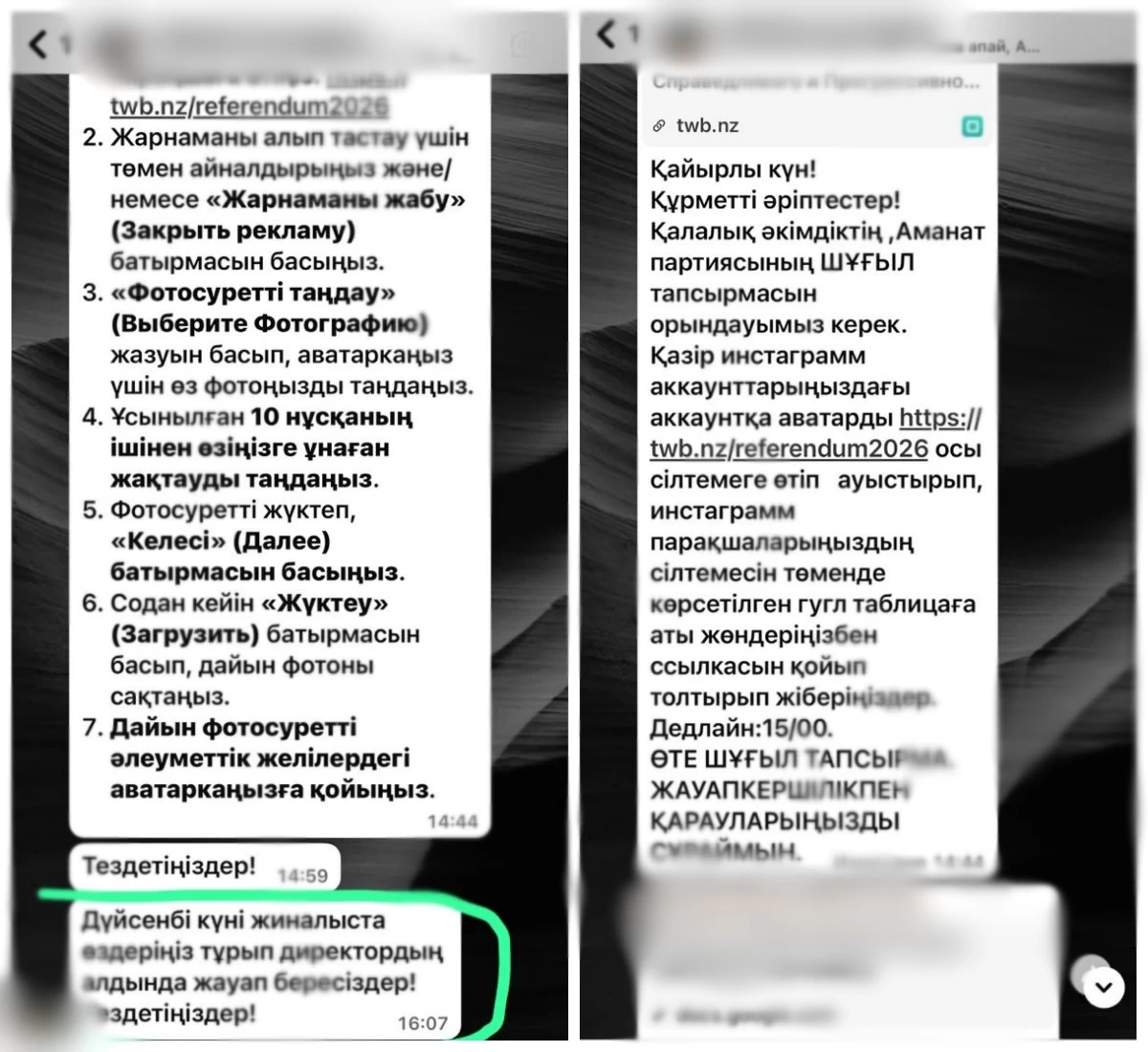 Мұғалімдер жіберген скриншоттарда хабарлама “қалалық әкімдіктің, Amanat партиясының шұғыл тапсырмасы” ретінде көрсетілген. Онда Instagram парақшасындағы аватарды https://twbnz.com/referendum2026 арнайы сілтемесінде тұрған дайын шаблонға ауыстыру талап етілген.