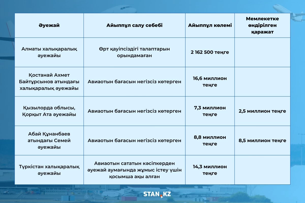 Бұл тек биыл салынған айыппұлдар. Ал бұған дейін де түрлі себептермен әуежайларға осындай жауапкершілікке тартылған.