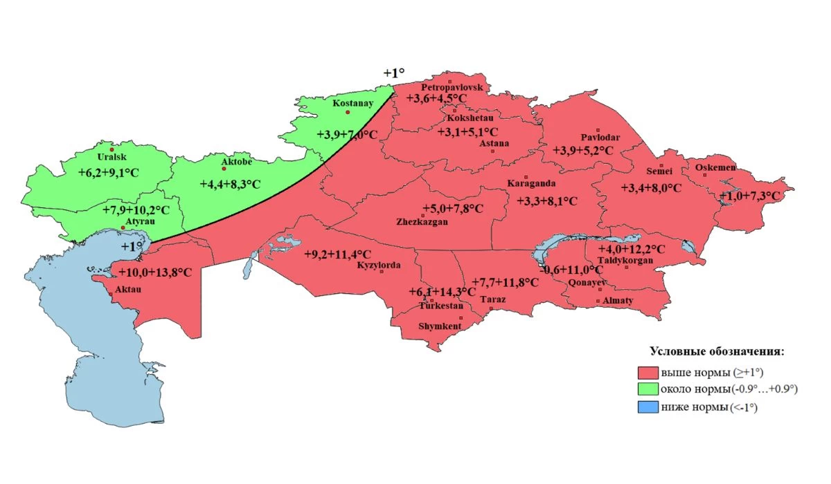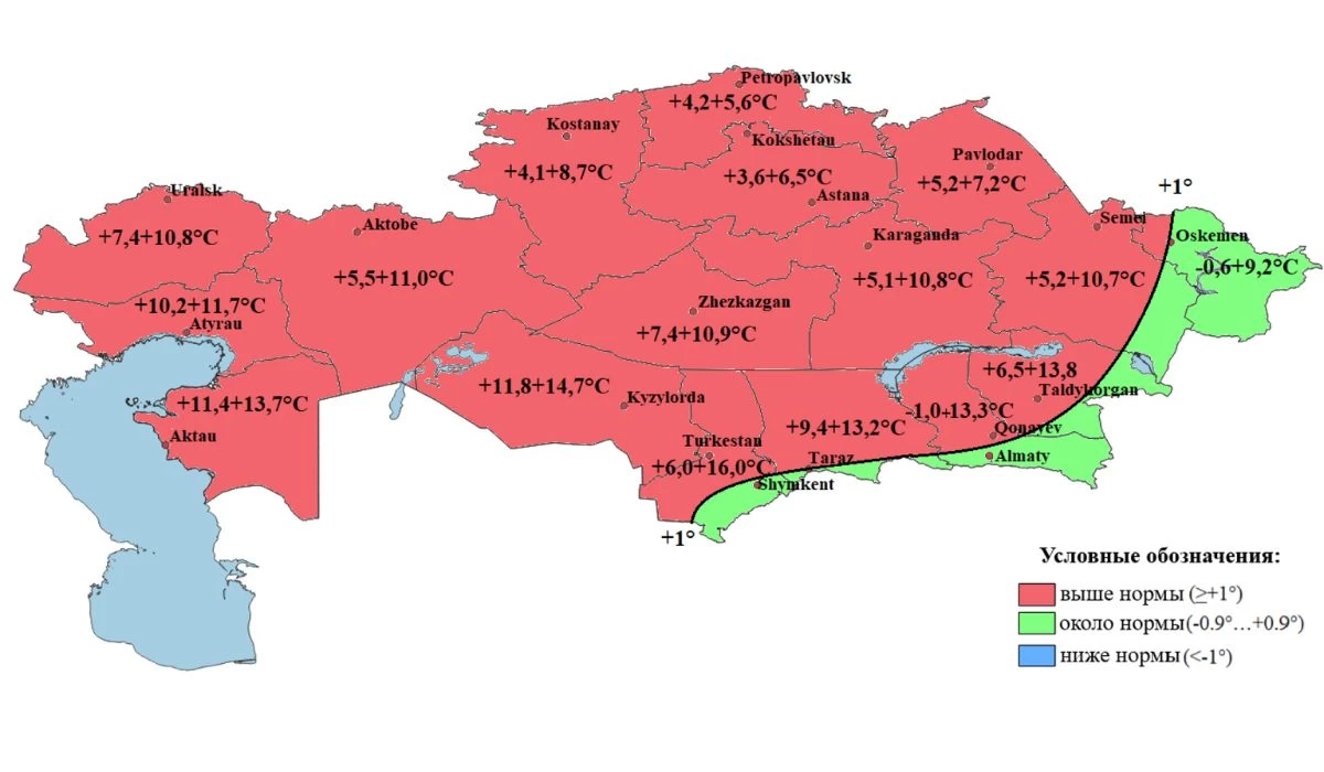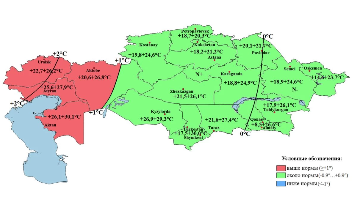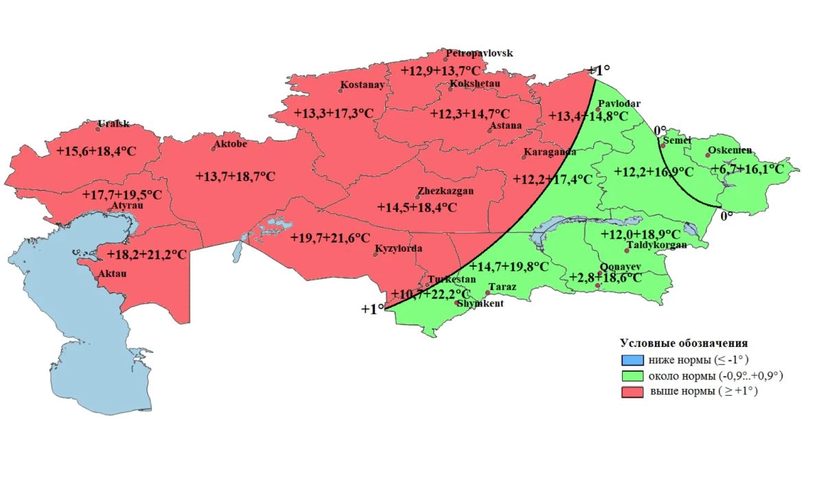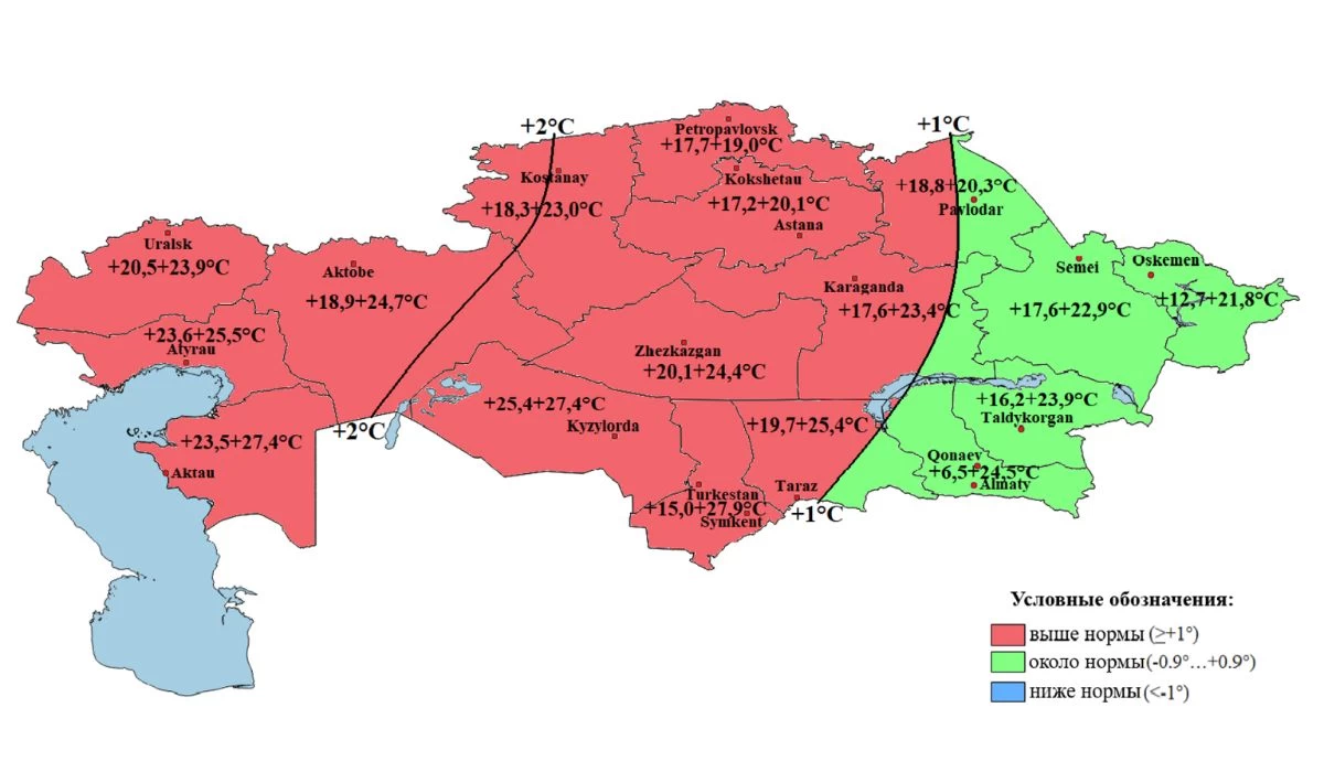 Маусымда Қазақстанның көп бөлігінде ауа температурасы нормадан 1-2 градусқа жоғары болады. Шығыс және оңтүстік-шығыс өңірлерде нормаға жақын болады.