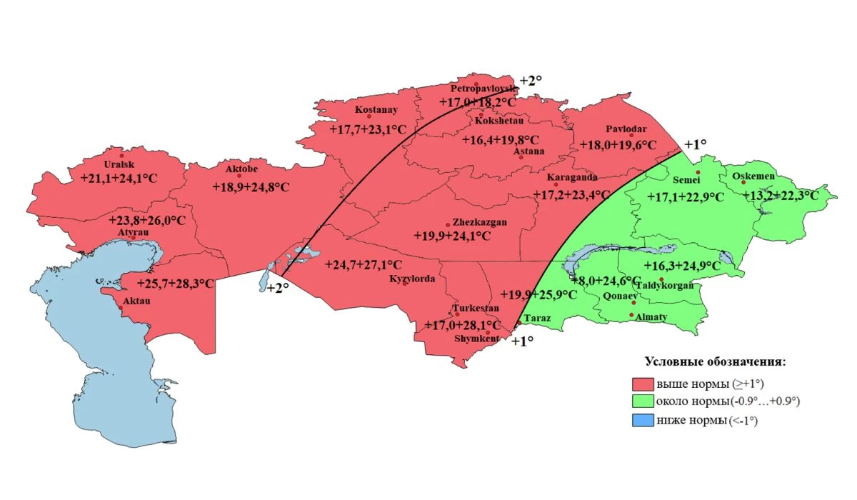 Тамызда Қазақстанның басым бөлігінде температура қайтадан нормадан 1-2 градусқа жоғары болады.