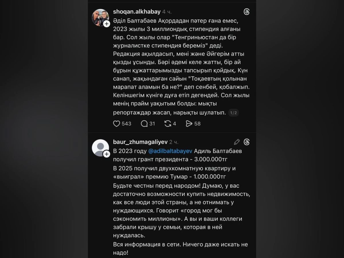"2023 жылы Әділ Балтабаев президент грантын 3 миллион теңге алды. 2025 жылы екі бөлмелі пәтер алып, "Тұмар" премиясын 1 миллион теңгемен "жеңіп шықты". Халық алдында адал болыңыз! Сізде бұл елдің басқа адамдары секілді өз күшіңізбен баспана сатып алуға мүмкіндік жеткілікті деп ойлаймын. Ал сіз бен әріптестеріңіз сол пәтерге мұқтаж отбасының баспанасын тартып алдыңыздар..." - деп шүйлікті Baur Zhumagaliyev.