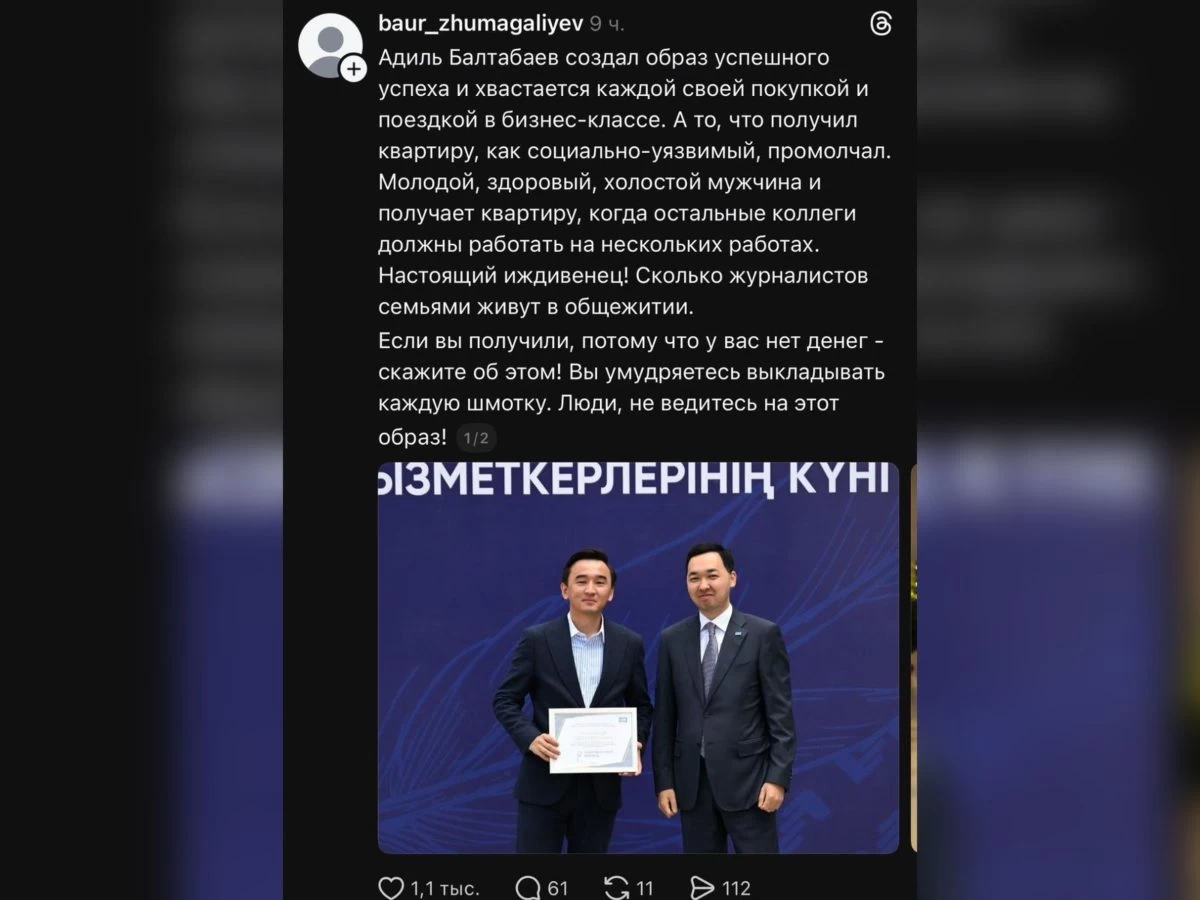 "2023 жылы Әділ Балтабаев президент грантын 3 миллион теңге алды. 2025 жылы екі бөлмелі пәтер алып, "Тұмар" премиясын 1 миллион теңгемен "жеңіп шықты". Халық алдында адал болыңыз! Сізде бұл елдің басқа адамдары секілді өз күшіңізбен баспана сатып алуға мүмкіндік жеткілікті деп ойлаймын. Ал сіз бен әріптестеріңіз сол пәтерге мұқтаж отбасының баспанасын тартып алдыңыздар..." - деп шүйлікті Baur Zhumagaliyev.