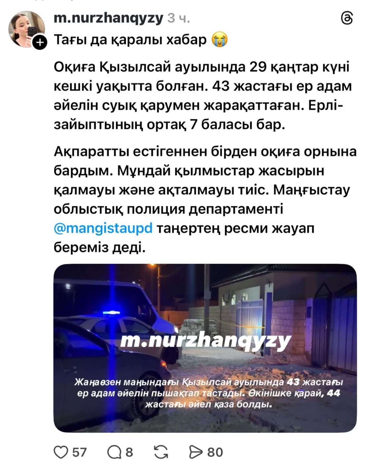 “29 қаңтарда Жаңаөзен қаласында пышақ жарақаты салдарынан 44 жастағы әйел көз жұмды. Марқұмның жұбайы күдікті ретінде ұсталып, уақытша ұстау изоляторына қамалды. Жанжал отбасылық-тұрмыстық негізде туған. Аталған дерек бойынша полиция Қылмыстық кодекстің 99-бабының 2-бөлігімен (Адам өлтіру) қылмыстық іс қозғады. Оқиғаның мән-жайын жан-жақты, толық және объективті анықтауға бағытталған тергеу әрекеттері жүріп жатыр”, – делінген хабарламада.