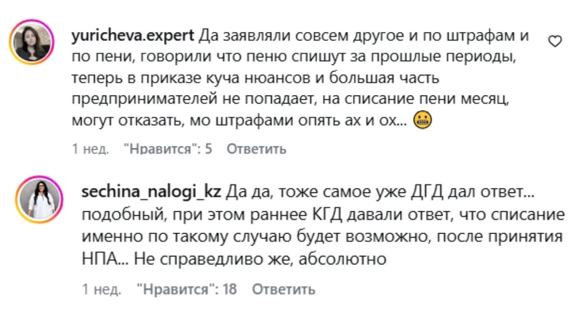 Пікір білдіргендердің қатарында Анастасия Сечина да бар. Ол бұған дейін мемлекеттік кірістер комитеті дәл осындай жағдайда өсімпұлдарды есептен шығару мүмкін болатынын айтқанын, алайда кейін жергілікті департаменттен басқа мазмұнда жауап келгенін айтып, мұны әділетсіз деп бағалады.