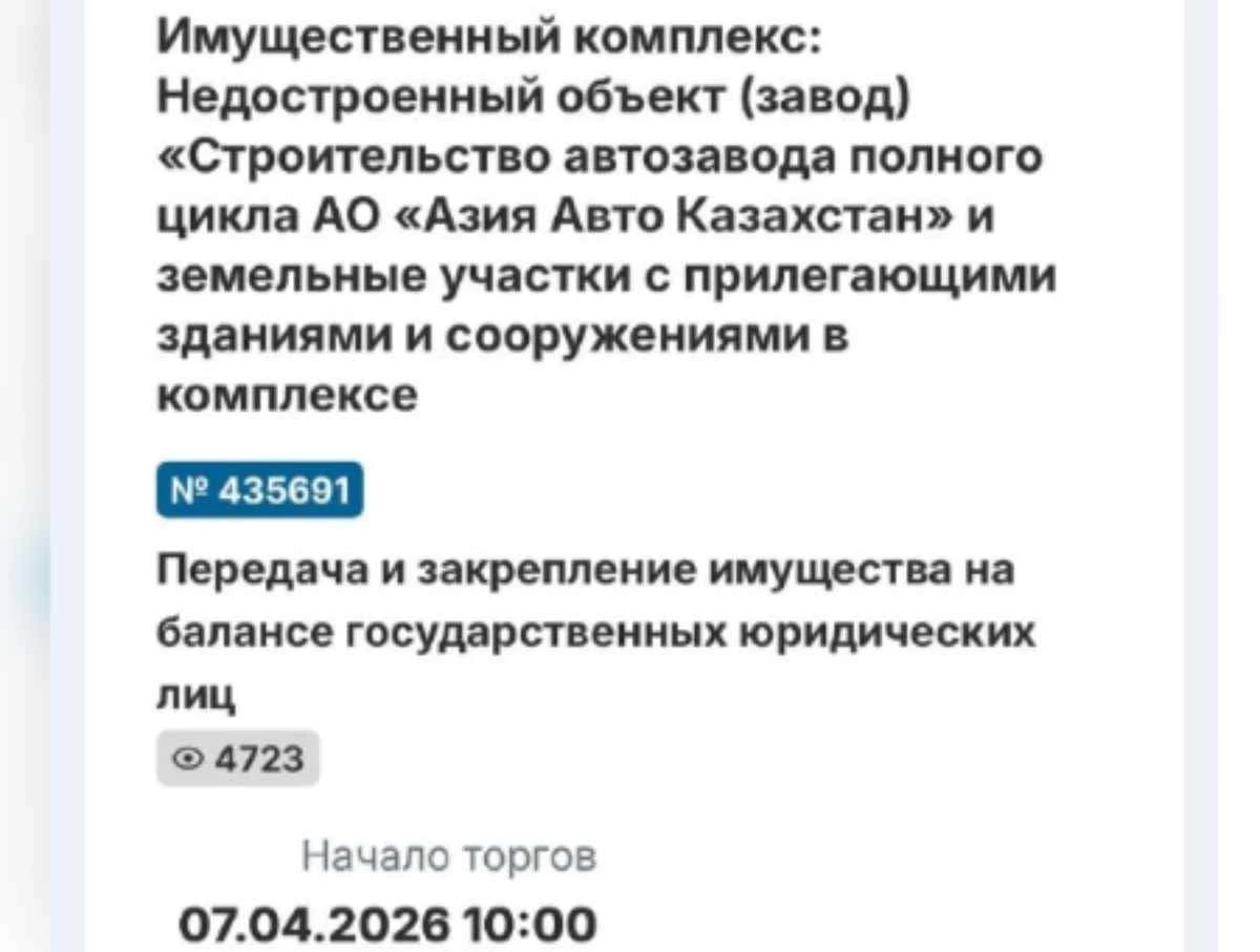 Өскемендегі құрылысы аяқталмаған "Азия Авто" зауыты саудаға шығарылды