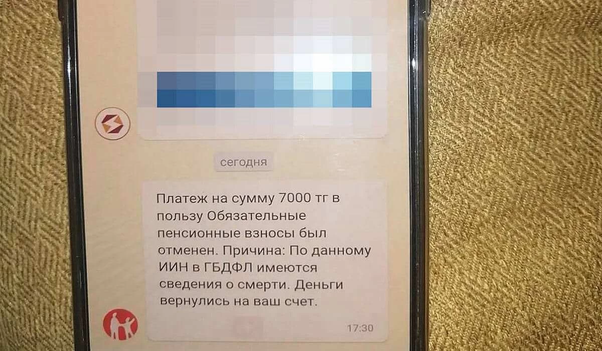 "Менің жағдайымды елестетіп көріңізші: Kaspi қосымшама менің қайтыс болғаным туралы жазбаша хабарлама келді. Мен қайтыс болыппын! Ол аздай, маған 7 000 теңге – зейнетақы қорына төлемім қайтарылды. Мұны қалй түмінуге болады?" - деп жазады құқық қорғаушы.