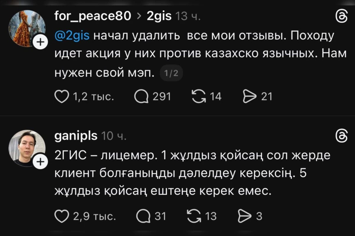 "2GIS менің барлық пікірлерімді өшіре бастады. Шамасы, қазір қазақ тілінде пікір жазатындарға қарсы бір "акция" жүріп жатқан сияқты. Бізге өзіміздің ұлттық картамыз (мэп) керек", "2GIS – екіжүзділер. 1 жұлдыз қойсаң сол жерде клиент болғаныңды дәлелдеу керексің. 5 жұлдыз қойсаң ештеңе керек емес", – деп ашуланды оқырмандар.
