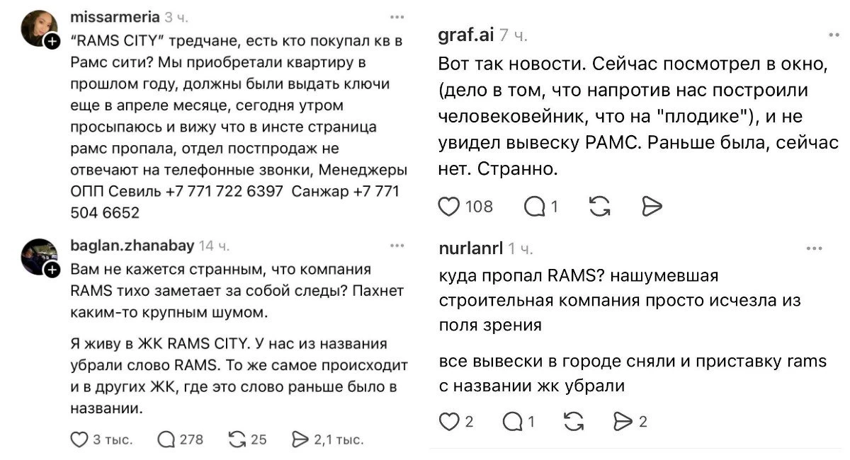 "Мен Rams City-де тұрамын. Біздің кешеннен Rams деген сөзді алып тастады. Басқа тұрғын үй кешендерінде де сол жағдай. Ресми инстаграм өшірілген, баннерлер алынып тасталды. Мұның бәрі компания банкрот болып, елден біржола кетпек сияқты әсер қалдырады", – деп жазды baglan zhanabay.