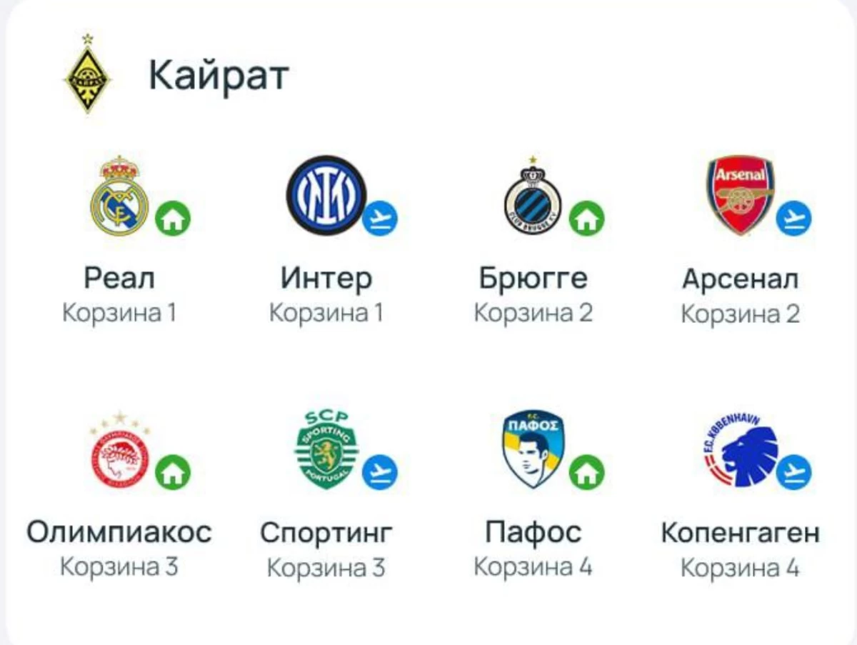 Жеребе бойынша “Қайраттың” қарсыластары – мадридтік “Реал Мадрид”, белгиялық “Брюгге”, грециялық "Олимпиакос" және кипрлық "Пафос" командалары Қазақстанға келеді.