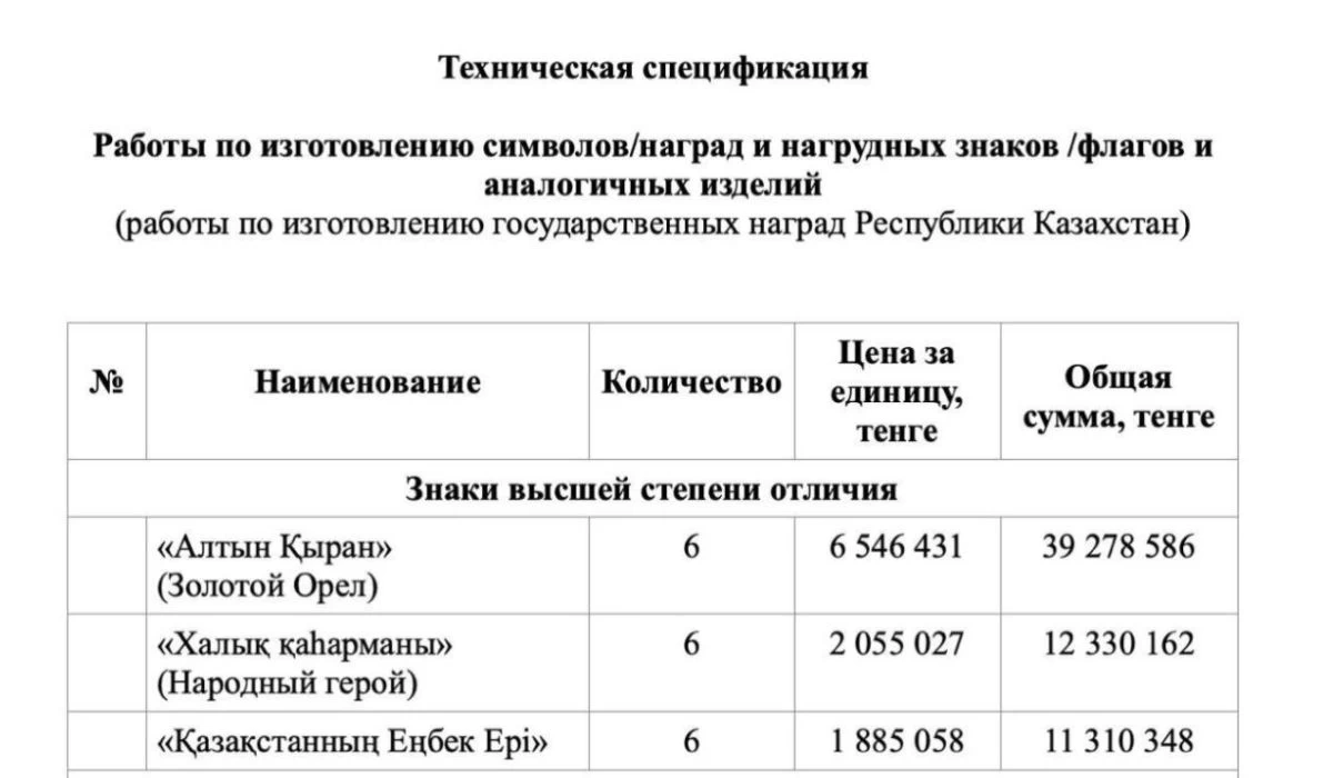 Ақпаратқа сәйкес, биыл Президент Іс басқармасы осындай бар-жоғы алты айрықша белгіні тапсырыс берген. Соның ішінде “Алтын Қыран” ордені дайындау құны жағынан ең қымбат марапат болып отыр. Бір данасының құны 6,5 миллион теңге тұрады.