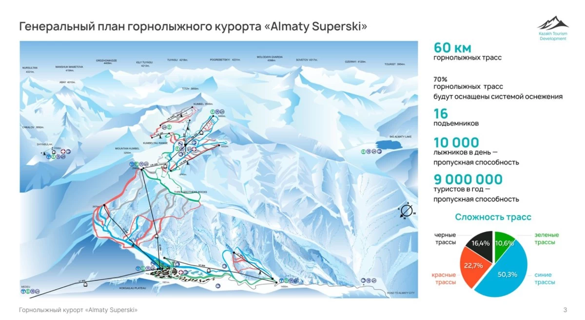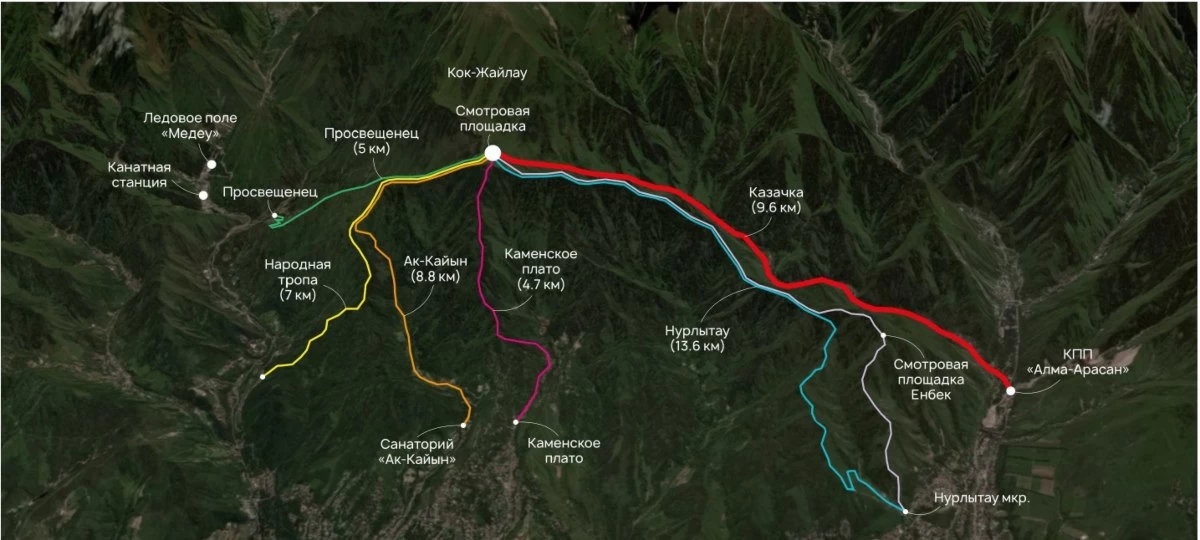 "Яғни, Медеуден отырып-ақ Шымбұлаққа да, Almaty SuperSki-ге де, тіпті Ой-Қарағай бағытына да кетуге мүмкіндік болады. Медеу – Almaty Superski бағыты бойынша арқанжол тартылады. Оның өткізу қабілеті 4,5 мың адам болмақ. Бір кабинаның сыйымдылығы 35 адамға дейін болуы мүмкін. Сондай-ақ Көкжайлауда жаяу жүргінші соқпақтары, автотұрақтар, бағыттаушы белгілер, дәретханалар, қалқалар (навес) және басқа да инфрақұрылым нысандары салу жоспарланған", – деді Ержан Еркінбаев.