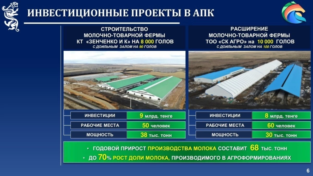 “КТ “Зенченко и К” строит ферму на 8 тыс. голов с доильной установкой «Карусель» на 90 мест. Хозяйство входит в десятку лучших и занимает 1-е место в Казахстане по продуктивности доения молока. В районе Магжана Жумабаева товарищество “СК Агро” построит крупнейшую в Центральной Азии ферму на 10 000 голов с уникальной доильной установкой “Карусель” на 100 голов коров. Годовой рост производства молока по двум проектам составляет 68 тыс. тонн. Это позволит увеличить долю молока, производимого агроформированиями, до 70%”, – подчеркнул Гауез Нурмухамбетов.
