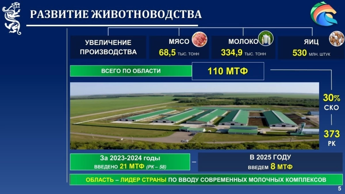 “Молочное направление в регионе активно развивается, и область сохраняет лидерские позиции по внедрению современных молочных комплексов. Сегодня в регионе действует 110 молочно-товарных ферм, что составляет около 30 % от всех 373 ферм, работающих в Казахстане. В 2023-2024 годах из 58 новых молочно-товарных ферм, построенных в стране, 21 реализована в нашей области, и до конца года мы введём в эксплуатацию ещё восемь современных комплексов”, – отметил глава региона.