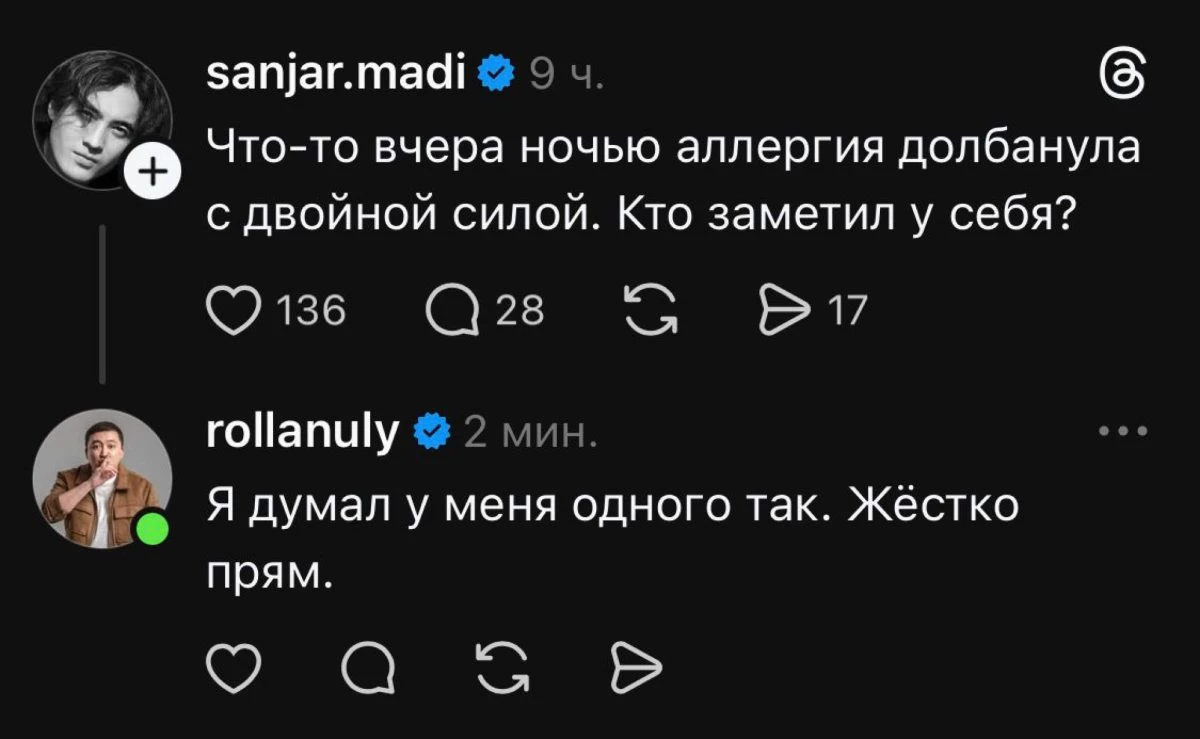 Актер Санжар Мади өз парақшасында "кеше аллергия екі есе күшпен соқты. Тағы кім байқады?", – деп жазды.