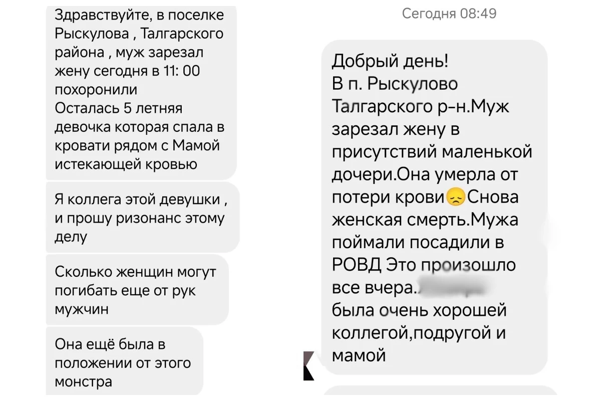 “Талғар ауданына қарасты Рысқұл ауылында ер адам кәмелетке толмаған қызының көзінше әйелін пышақтап өлтірді. Әйел көп қан жоғалту салдарынан көз жұмды. Тағы бір әйел қазасы. Күйеуі ұсталып, полиция бөліміне қамалды. Бұл оқиға 14 қаңтар күні болған. Марқұм өте жақсы әріптес, құрбы әрі ана еді”, – делінген жазбада.